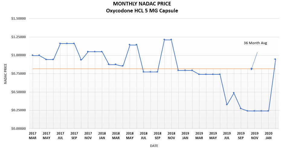 Looking closer at the historical NADAC pricing of the oxycodone HCL 5 mg capsule, although the price increase may seem alarming at first, the NADAC price in March of 2019 was $0.74115 having an annual change of only 27.5% through February 2020 (see chart). During the past 36 months, the price was as high as $1.2117, October and November 2018, and as low as $0.24124 from October 2019 through January 2020. The 36-month average NADAC price is $0.81723.