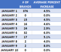 FAYETTEVILLE, NEW YORK, UNITED STATES, January 13, 2021 /EINPresswire.com/ — The pharmaceutical industry continues the trend of raising brand name drugs in January. After raising the prices of 376 brands on January 1st with an average price increase of 4.5%, manufacturers have raised the prices for 108 additional brand drugs through January 10th averaging 4.8%.