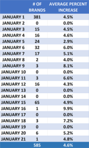 FAYETTEVILLE, NEW YORK, UNITED STATES, January 22, 2021 /EINPresswire.com/ — The pharmaceutical industry continues to increase the price of brand name drugs in January. After raising prices on 381 brands January 1st, with an average price increase of 4.5%, manufacturers have raised the price on 204 additional brand drugs through January 21st averaging 4.9%.