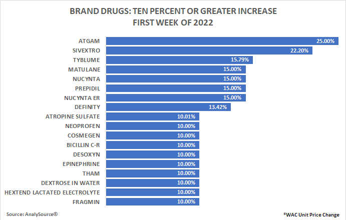 FAYETTEVILLE, NY, UNITED STATES, January 12, 2022 /EINPresswire.com/ — The new year begins with price changes on hundreds of single-source brand name drugs, as determined by the Centers for Medicare and Medicaid Services. Considering only price increases for the first week of January, a total of 458 brands rose an average 5.06% versus 483 brands averaging a 4.50% increase in 2021. Overall inflation for 2021 was 7.0% and 1.4% for 2020 to provide context for the drug price increases. Eighteen brands took price increases of at least 10.0% this year (see chart). Noteworthy brands taking price increases in 2022 were Tyblume [Exeltis] – an oral contraceptive at 15.79%, Nucynta [Collegium] – an opioid pain medication at 15.00%, and Tham [Hospira] – indicated for the prevention and correction of metabolic acidosis, at 10.00%.