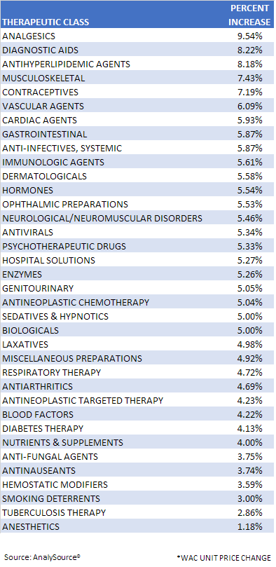 When grouping brands into their respective therapeutic class, analgesics had the highest percent increase at 9.54%, followed by diagnostic aids and antihyperlipidemic agents at 8.22% and 8.18% respectively. See chart for the complete list of therapeutic classes with price increases.